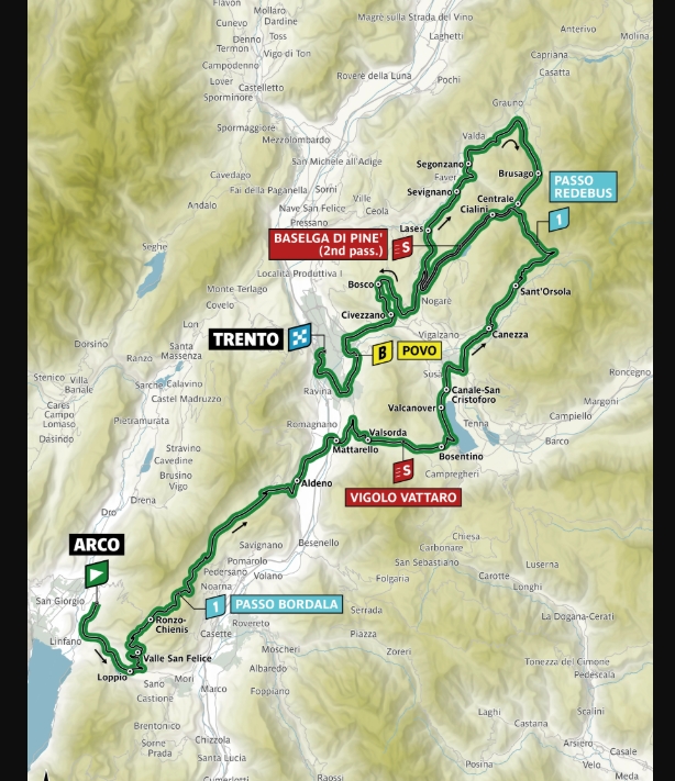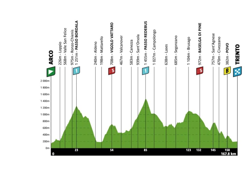 La quarta tappa del Tour of the Alps 2026, da Arco a Trento (167,8 km), con i suoi 3600 metri di dislivello, si candida al ruolo di Queen Stage dell’edizione 2026. Dopo appena otto chilometri dalla partenza, il gruppo affronta subito il GPM di prima categoria del Passo Bordala (14,8 km al 6,9%), con i primi tratti fino a Ronzo Chienis in comune con la salita del Passo di Santa Barbara.