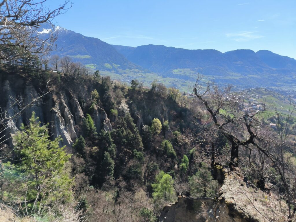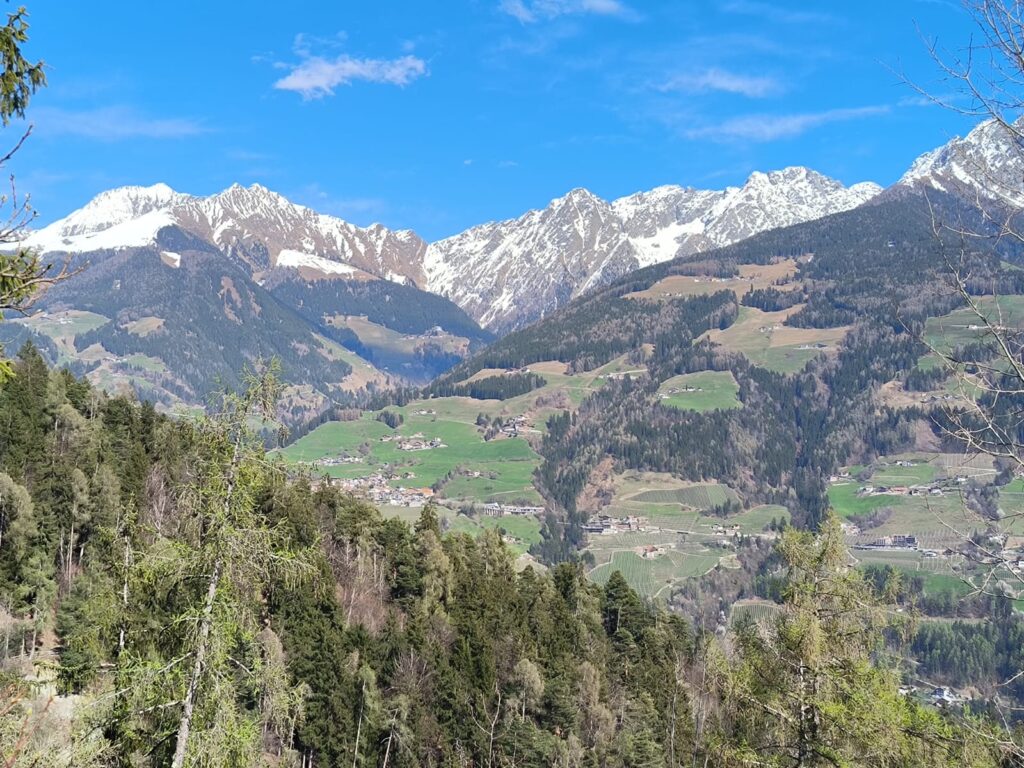 Si riparte, di nuovo in salita, lungo il sentiero 23 A, che regala degli scorci panoramici sulla Valle di Meran e più vicino le Piramidi di Terra. Superata la prima parte di salita si imbocca il sentiero 6 che in costante e regolare pendenza costeggia il Rio Sopranes. Qui, si ritorna sul sentiero della roggia di Kuens in lieve discesa, che conduce fino a Riffian, tappa di giornata.