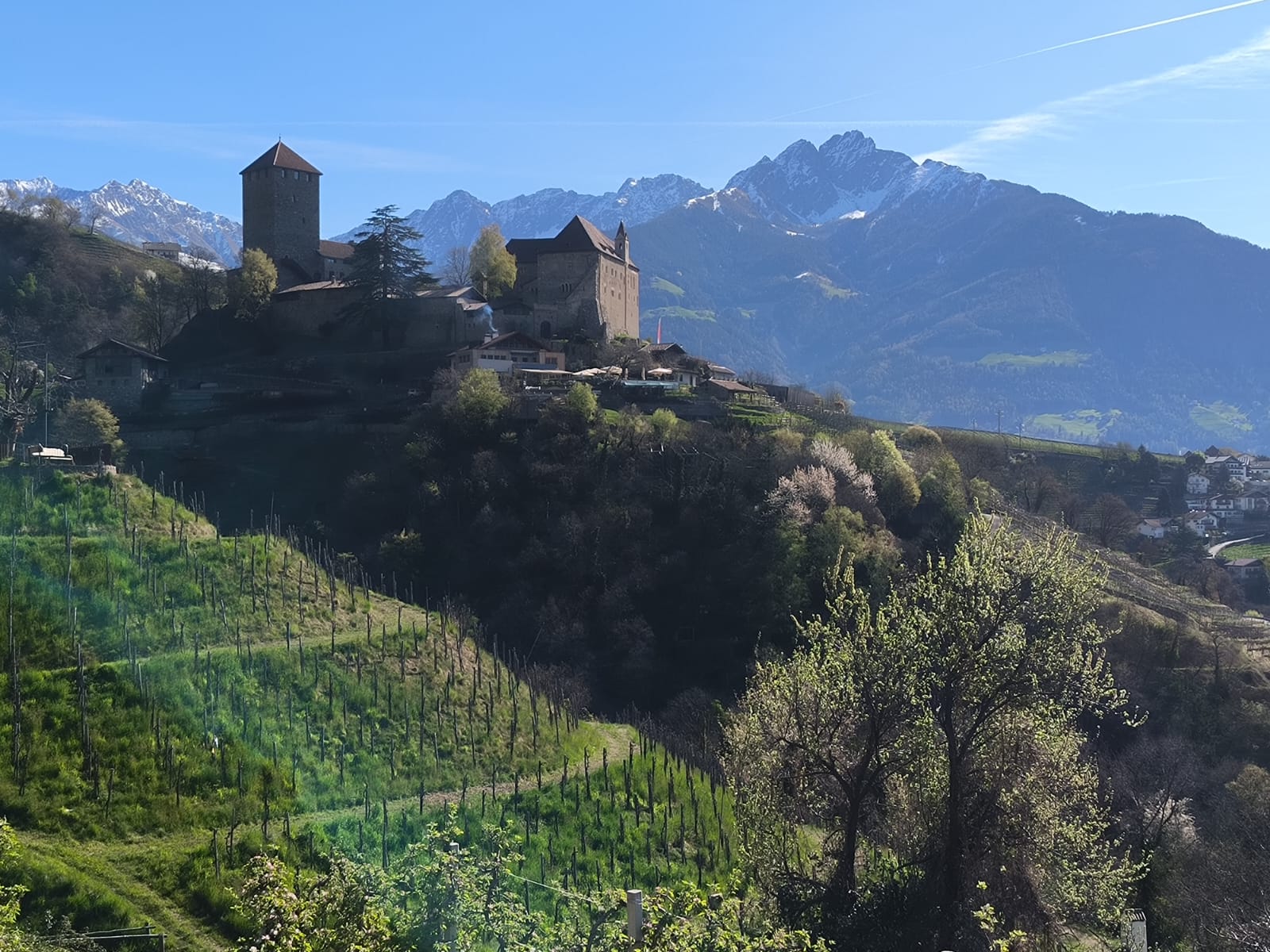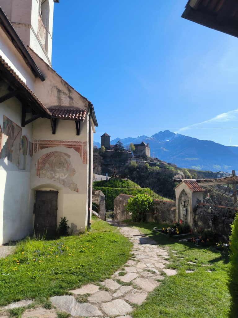 La tappa prende il via da Algund seguendo la Jacobsweg, per poi imboccare la Algunder Waalweg. La prima parte del percorso è in leggera salita fino all’imbocco della Via Crucis che porta fino alla Chiesa di S.Peter, dove si sente il peso dello zaino e la pendenza del sentiero si intensifica. Tuttavia la fatica viene subito ripagata dalla meravigliosa vista di Castel Tirolo, che vale sicuramente una visita.
