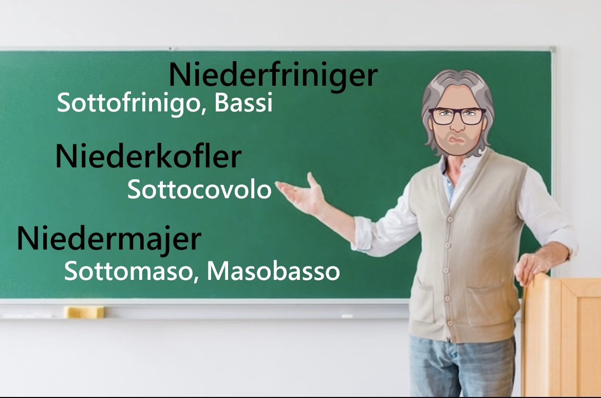 Così, Niedermajer e Niederstätter diventano Sottomaso o Masobasso, Niederwanger, Sottocampo o Campobasso, Niederwieser, Prati o Dalprà o Pratobasso… (continua)