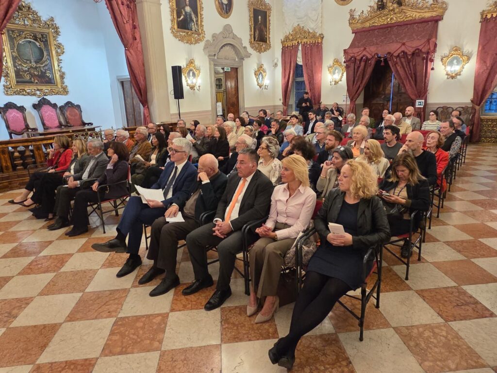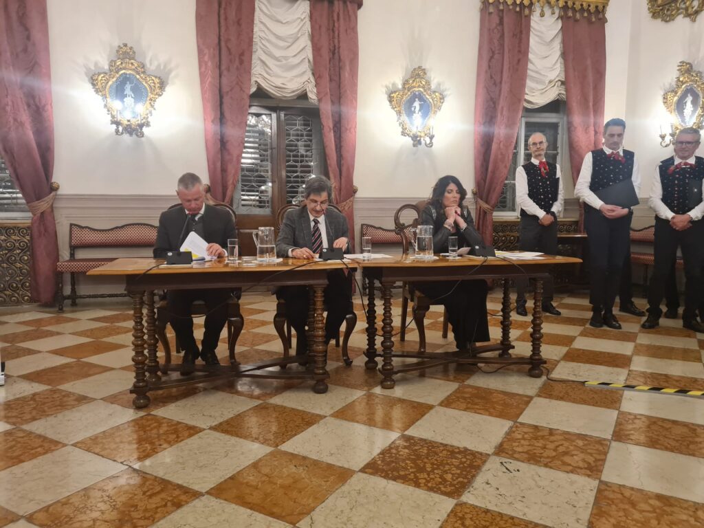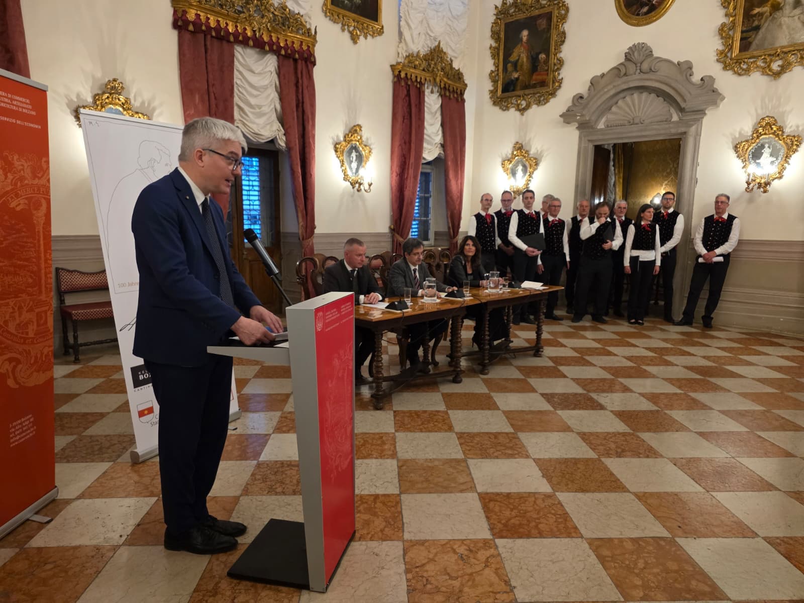 A fare da sfondo al racconto, mon poteva esserci luogo più adatto della bellissima Sala di Rappresentanza, dove si tenne l’ultimo consiglio comunale cittadino prima della deposizione di Perathoner. Sala piena: esponenti della vita politica e della cultura cittadina e provincia ma anche privati cittadini: un pubblico attento ha seguito la lettura scenica accompagnata dalle voci del Kleiner Chor Bozen, dispensando applausi frequenti e sentiti.