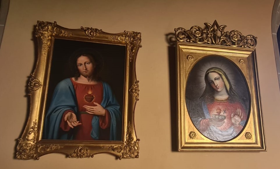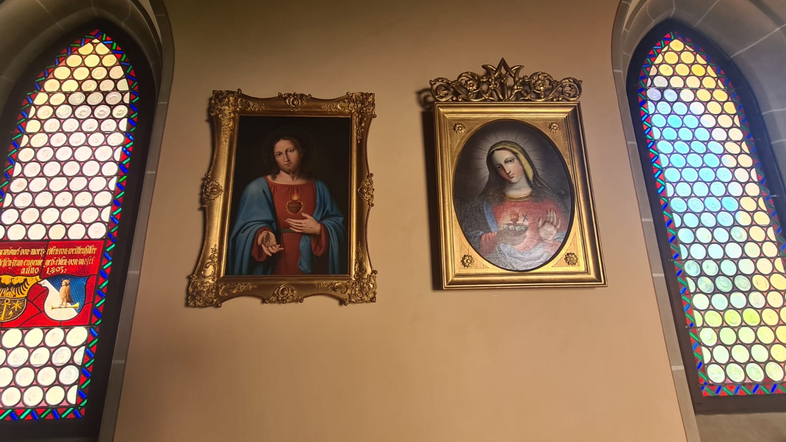 Una volta entrati, siamo rimasti incantati dall’atmosfera, moltiplicata dalla luce soffusa che penetrava dalle due grandi vetrate istoriate. Proprio nel mezzo fra le finestre, abbiamo notato due quadri, due immagini sacre diverse per fattura, per taglio e pure per cornice, ma praticamente uguali per soggetto: il Sacro Cuore di Maria a destra; a sinistra invece Herz-Jesu, il Sacro Cuore di Gesù.