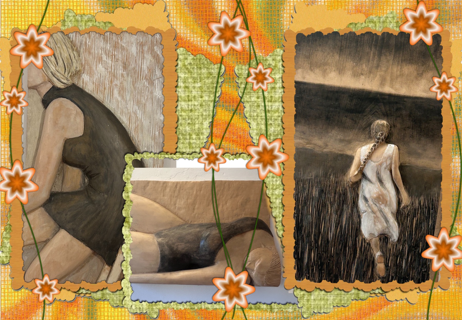“Inizialmente ero convinta di poter scolpire la pietra con un’idea romantica di martello e scalpello”, racconta Paola, “il maestro Petri mi ha suggerito di cambiare prospettiva perché oggi la scultura è fatta con le macchine e lavorare la pietra avrebbe voluto dire polveroni immensi impossibili per un laboratorio casalingo e così mi sono dovuta orientare sul legno utilizzando la motosega per poi passare allo scalpello. Il bassorilievo è la realizzazione che più mi aggrada. Prevalentemente sono figure femminili di spalle perché mi piace lasciare libero pensiero a chi osserva le opere su quello che potrebbe essere visto. Il tiglio è la tipologia di legno che preferisco utilizzare perché oltre ad essere più morbido e meno fibroso ha pochi nodi che hanno una particolarità: amano manifestarsi in punti critici della figura come testa e braccia.