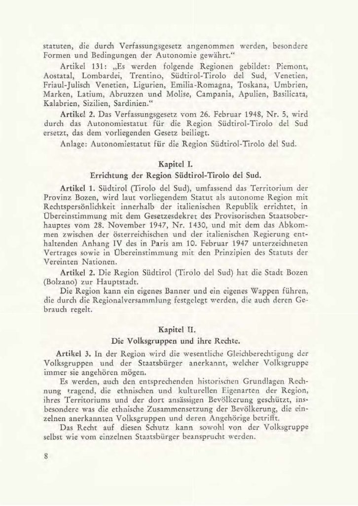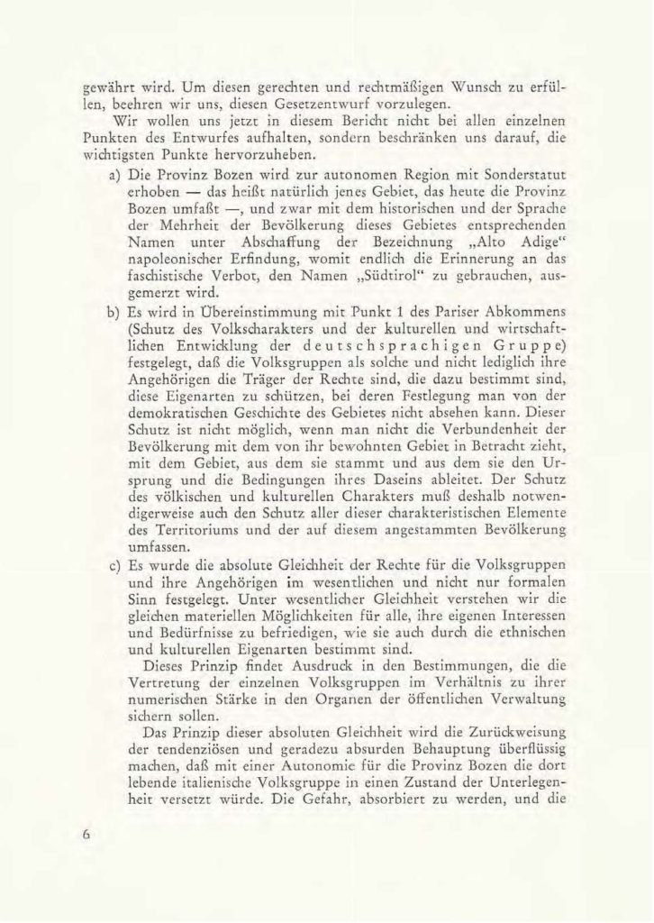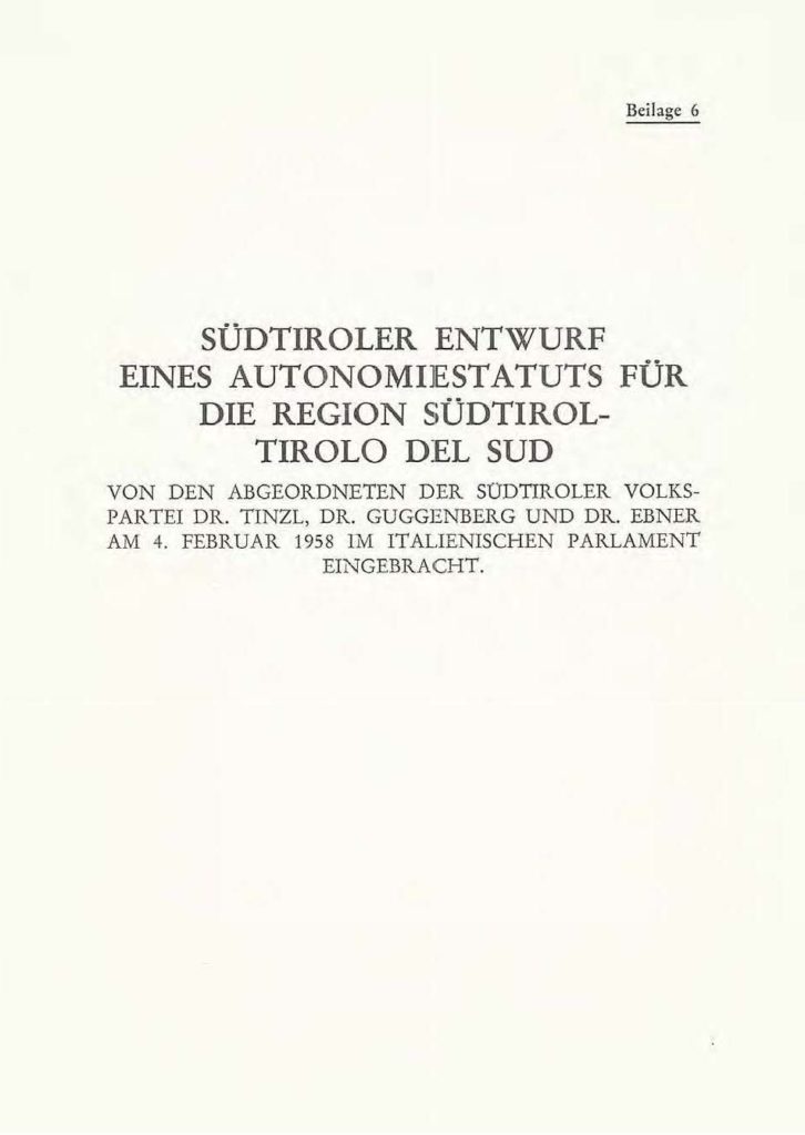 Den besten Beweis dafür liefert der „Südtiroler Entwurf eines Autonomiestatuts für die Region Südtirol-Tirolo del Sud“, der von den drei Südtiroler SVP-Parlamentariern Toni Ebner, Otto von Guggenberg und Karl Tinzl am 4. Februar 1958 im italienischen Parlament eingebracht wurde. Von dem aus insgesamt 13 Kapiteln bestehenden Gesetzentwurf hervorzuheben ist der diesbezügliche Bericht. Punkt a) lautet nämlich: „Die Provinz Bozen wird zur autonomen Region mit Sonderstatut erhoben – das heißt natürlich jenes Gebiet, das heute die Provinz Bozen umfaßt –, und zwar mit dem historischen und der Sprache der Mehrheit der Bevölkerung dieses Gebietes entsprechenden Namen unter Abschaffung der Bezeichnung ‚Alto Adige‘ napoleonischer Erfindung, womit endlich die Erinnerung an das faschistische Verbot, den Namen ‚Südtirol‘ zu gebrauchen, ausgemerzt wird.“
